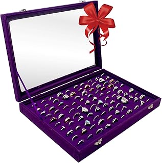 100スロットリングストレージディスプレイボックス 透明蓋付き ジュエリートレイオーガナイザー イヤリングホルダーショーケース パープル