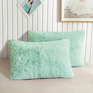 XeGe フェイクファー スローピローケース フラシ天 シャギー ウルトラソフト 枕カバー ふわふわ クリスタル ベルベット 装飾枕カバー ジッパー開閉 2枚セット (スタンダード、アクアグリーン)