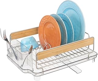 mDesign 大型キッチンカウンター シンクディッシュ乾燥ラック 竹製アクセント - 取り外し可能なカトラリートレイ & ドレインボード 調節可能なスイベル注ぎ口 - 3ピース BPAフリーカトラリーキャディ サテン/クリア