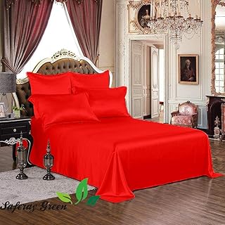 Saferay Green 低刺激性耐退色性100%ピュアシルクサテン 650-TC 4枚シーツセット レッド 無地 RV キング/スーパーキング サイズ 72x80インチ 最大21インチのディープポケット